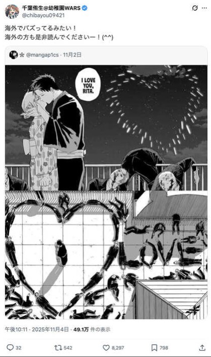 現在、漫画『幼稚園WARS』のある告白シーンが海外の読者の間で急速に話題となり、大拡散(バズ)千葉侑生氏(公式Xアカウント:@chibayou09421)も自身のX(旧Twitter)で言及するほどの注目を集めています。