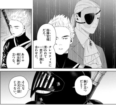 ファルシュはヴァルロスたちの会話から、これまで人相書きがなかった指揮官の名が「レーヴェ」であること、そして彼が南側諸国での工作活動で戦果を上げた帝国最北端領の総督であることを突き止めます。