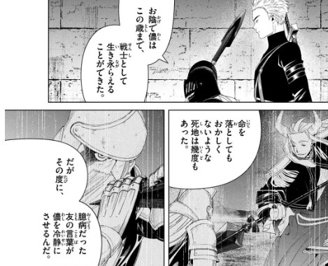 ヴァルロスは自身の頑強さについて「戦士ならこのくらい普通だ」と口にしますが、それは古い友であるアイゼンの口癖であったことを明かします。