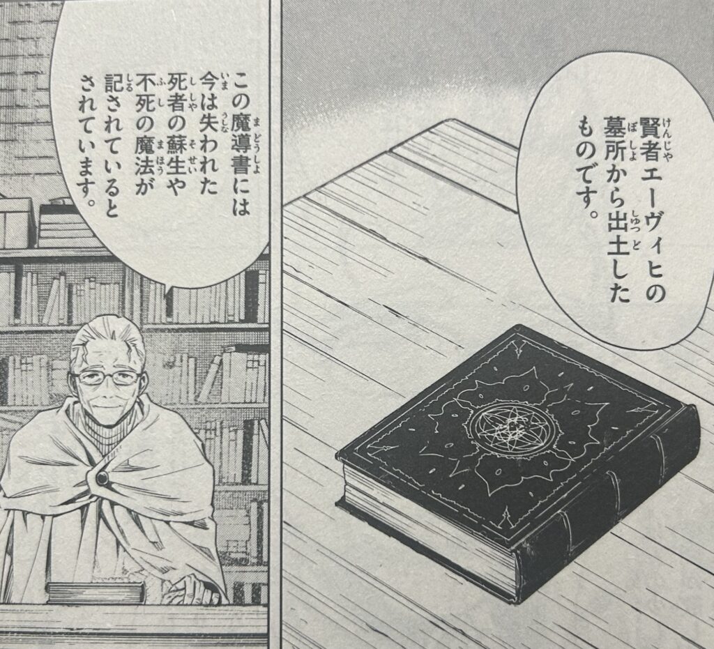 この魔導書は、「復活」や「不死」をテーマとしていたと伝承されていました(ただし、ハイターがフリーレンを引き留める口実として利用した可能性もあります)。