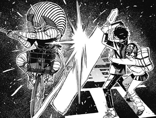 モモは制服を取り、「止まれ」の路面表示の裏に回り込んでドリスの攻撃を回避します。ドリスが攻撃を放った瞬間、オカルンはダミー人形を身代わりとし、モモはドリスの包帯を掴みます。